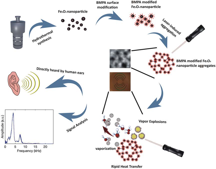 Laser-induced photoexcited audible sound effect based on reticular 2-bromo-2-methylpropionic acid modified Fe3O4 nanoparticle aggregates